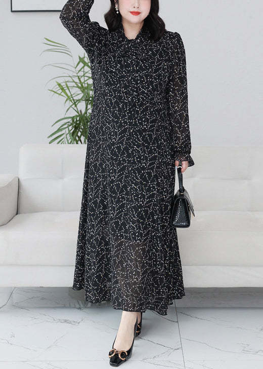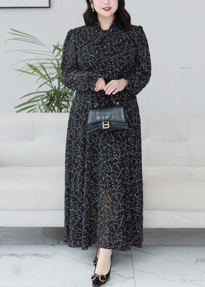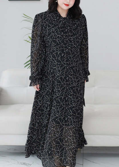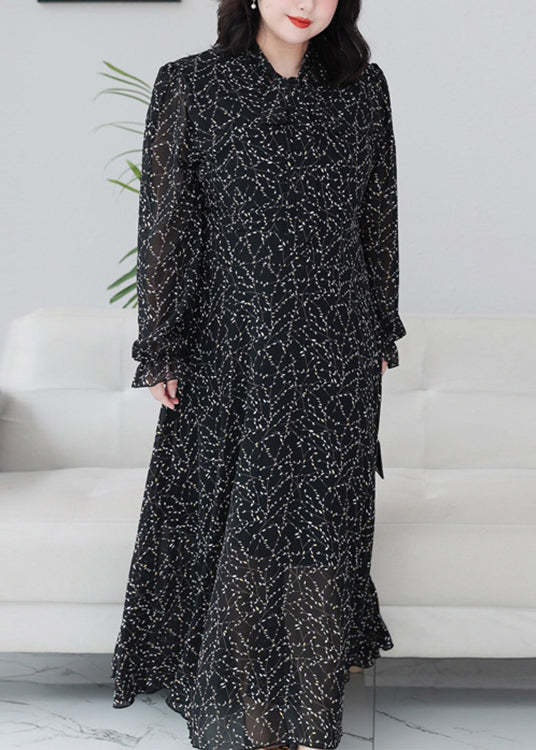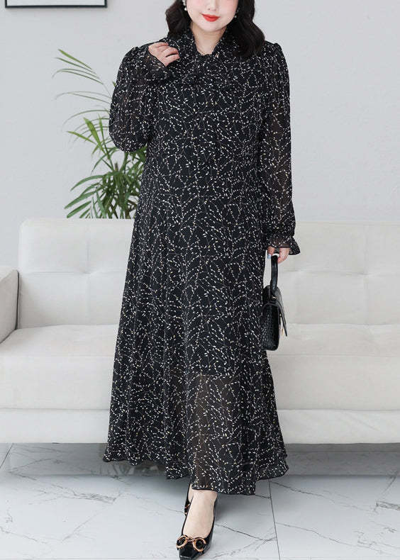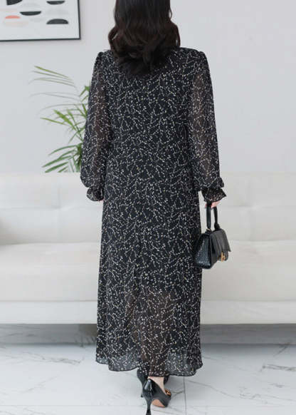 Classy Black Print Ruffled Chiffon Maxi Dresses Long Sleeve