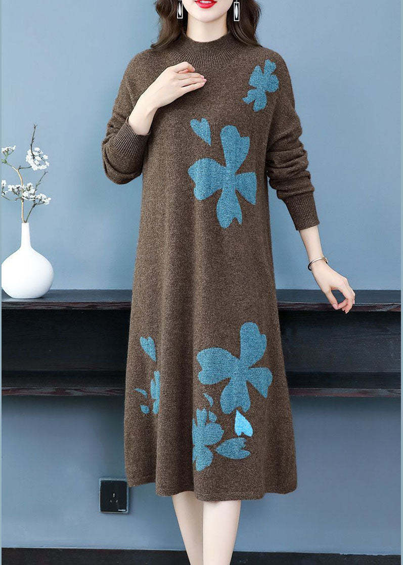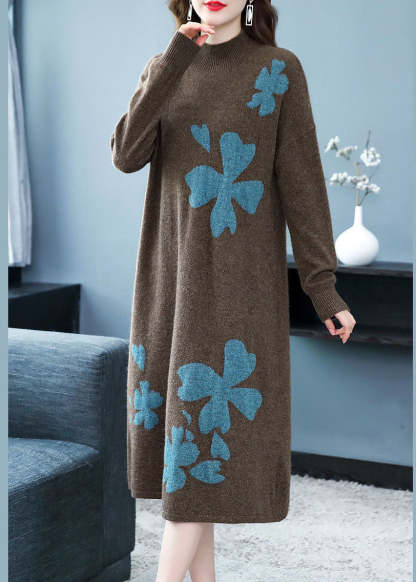 Coffee Cashmere Long Sweater Dress Stand Collar Embroideried Long Sleeve