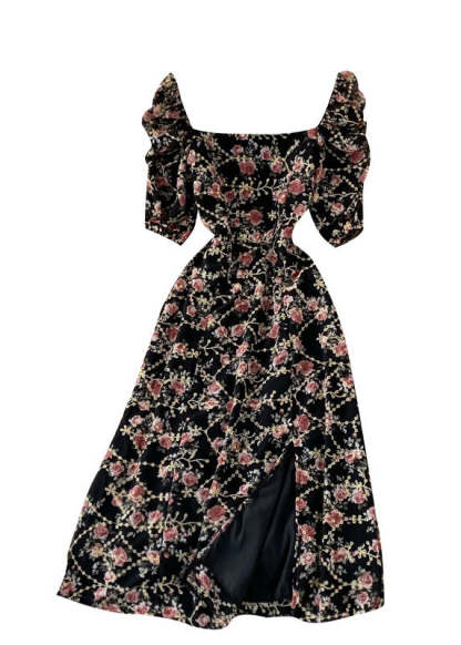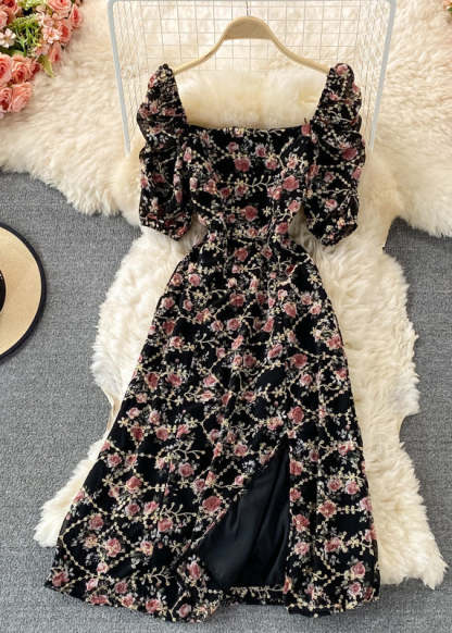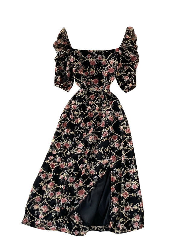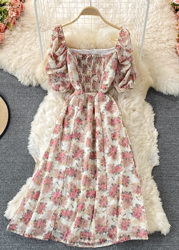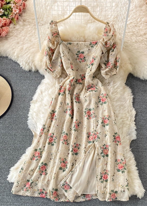 Cute Apricot Square Collar Print Tunic Chiffon Maxi Dresses Short Sleeve