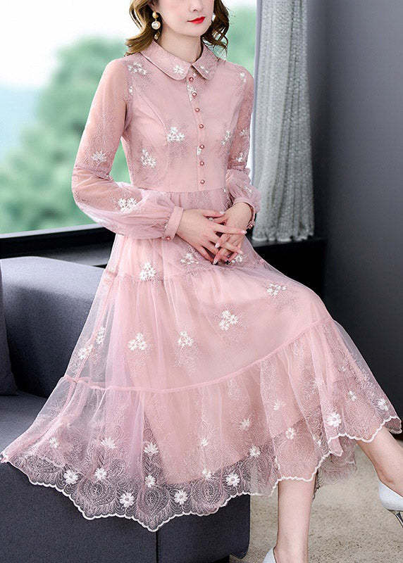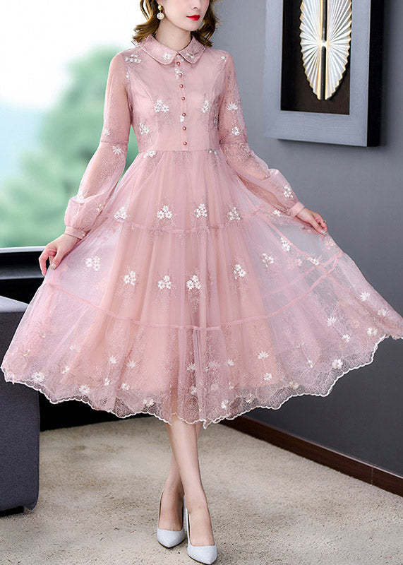 Cute Pink Peter Pan Collar Embroideried Floral Patchwork Button Tulle Maxi Dress Long Sleeve