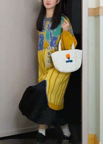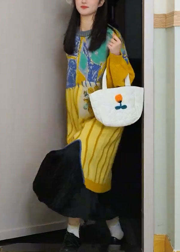 Cute Yellow O-Neck Striped Cotton Knit Maxi Dress Long Sleeve