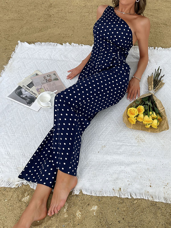 Dark Navy Polka Dot One-Shoulder Long Sleeves Asymmetrical Tatting Summer Jumpsuit For Women