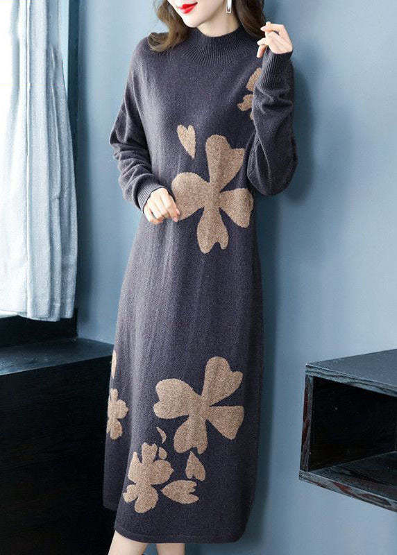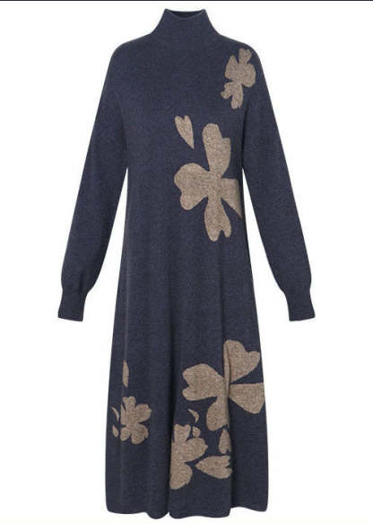DIY Purple Stand Collar Embroideried Knit Cashmere Sweater Dress Long Sleeve