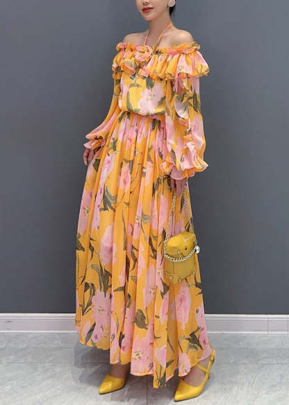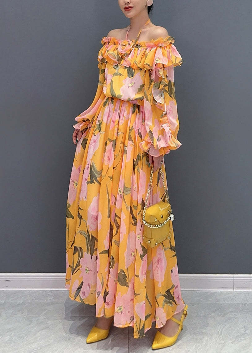 Fashion Blue Cold Shoulder Ruffled Patchwork Chiffon Dresses Long Sleeve