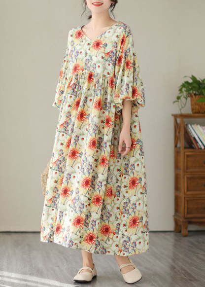 Fine Floral V Neck Wrinkled Patchwork Cotton Long Dresses Summer