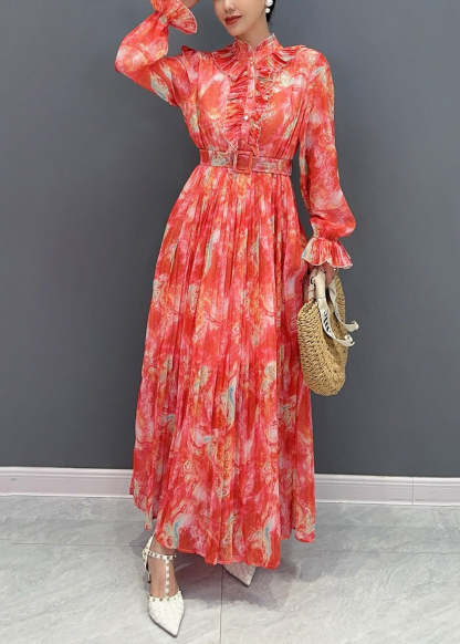 Fitted Blue Ruffled Print Sashes Chiffon Dresses Long Sleeve