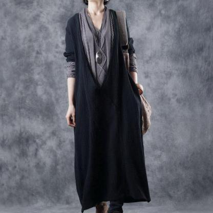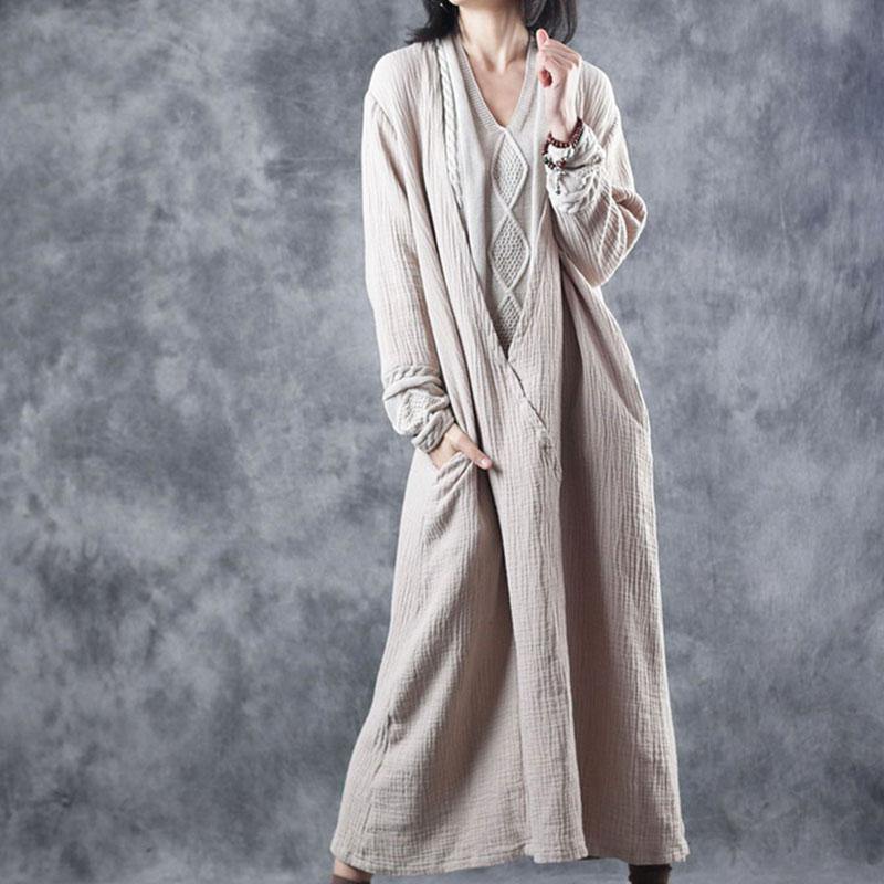 French Black Apricot V Neck Patchwork Pockets Fall Knit Long Sleeve Maxi Dress
