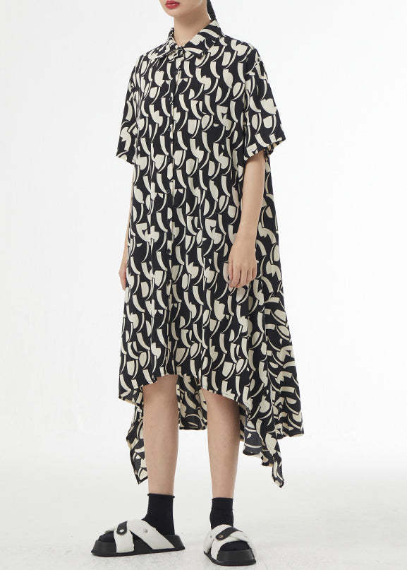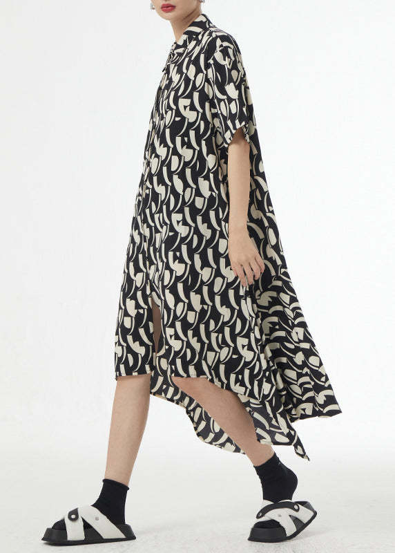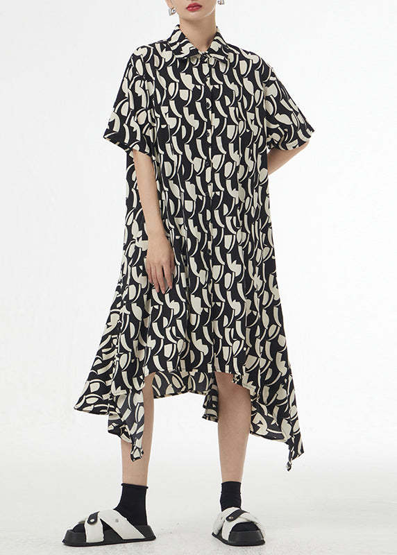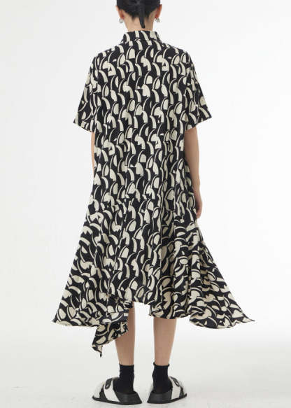 French Black Asymmetrical Print Patchwork Silk Cotton Shirts Dress Summer