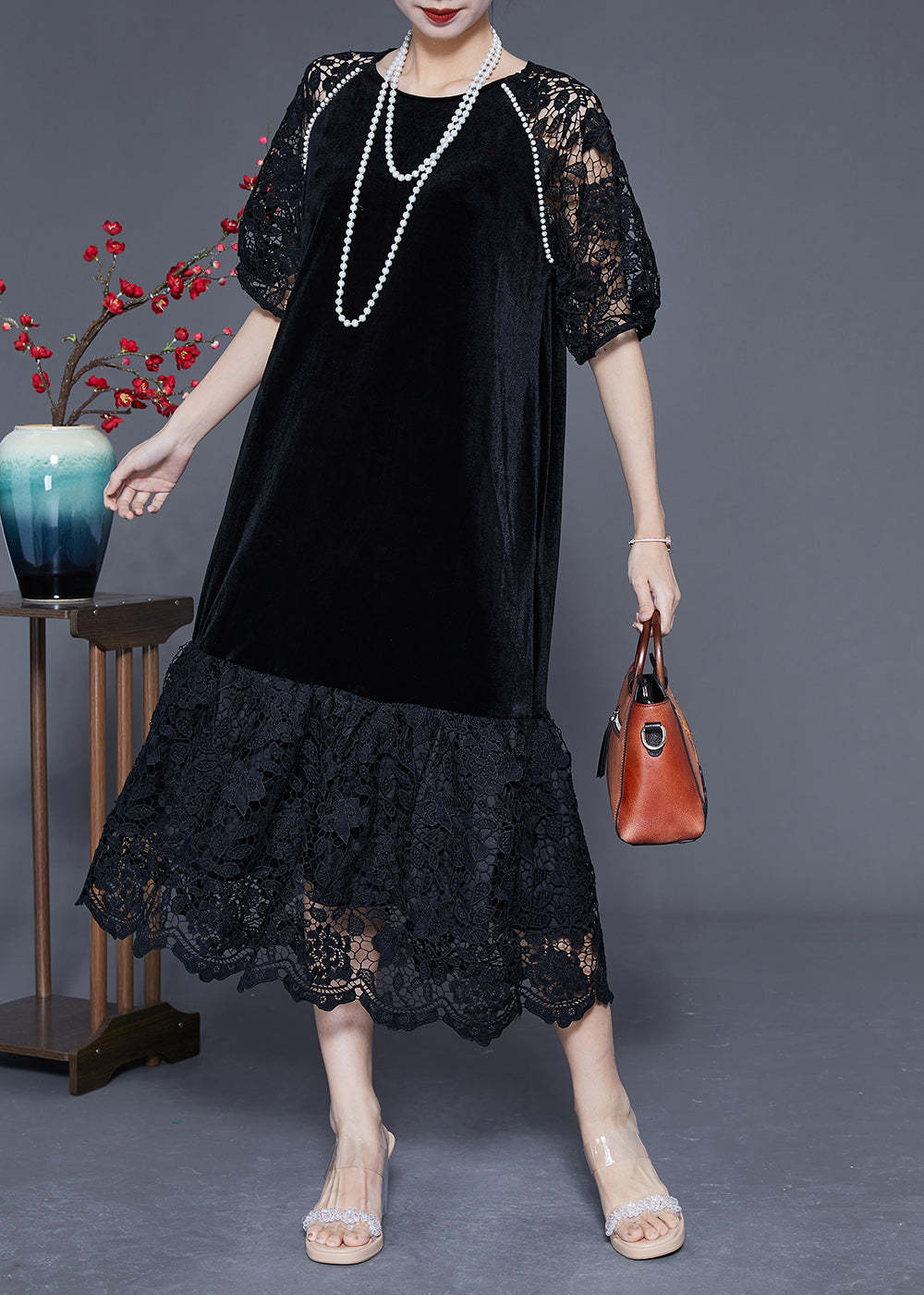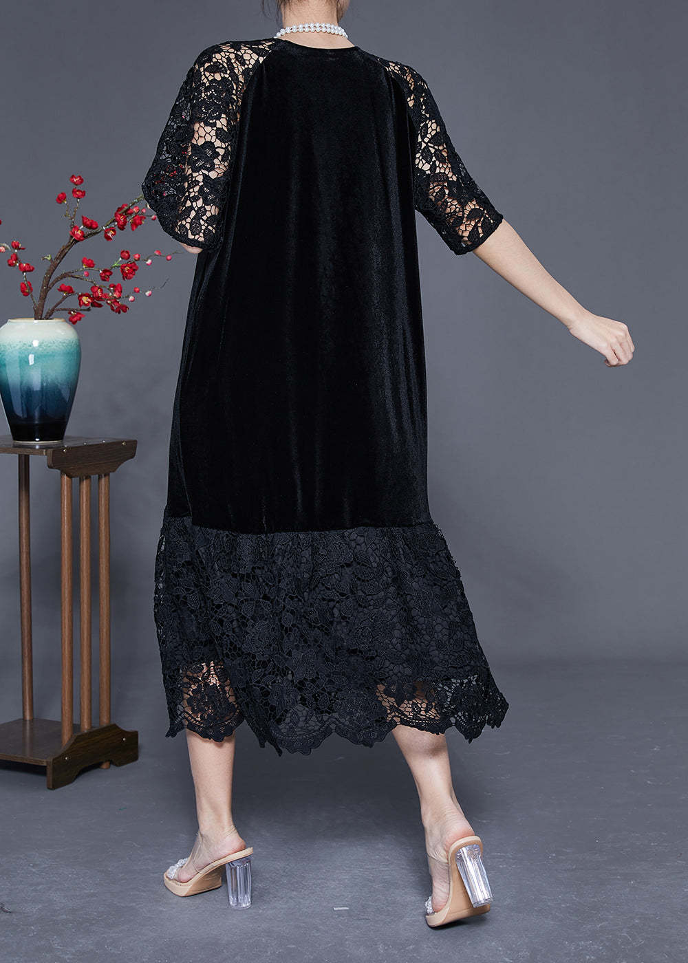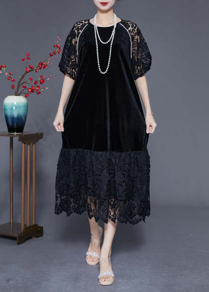 French Black Hollow Out Lace Patchwork Silk Velour Maxi Dresses Summer