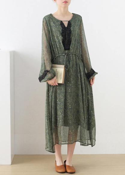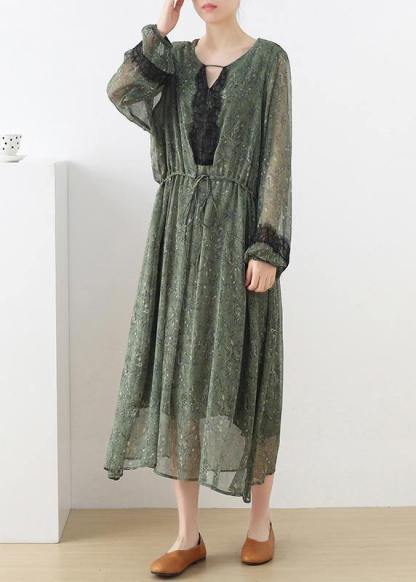 French Green Print Chiffon Patchwork Summer Vacation Dresses