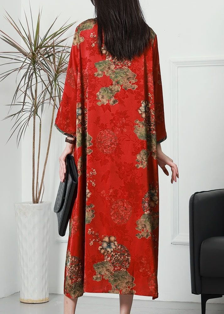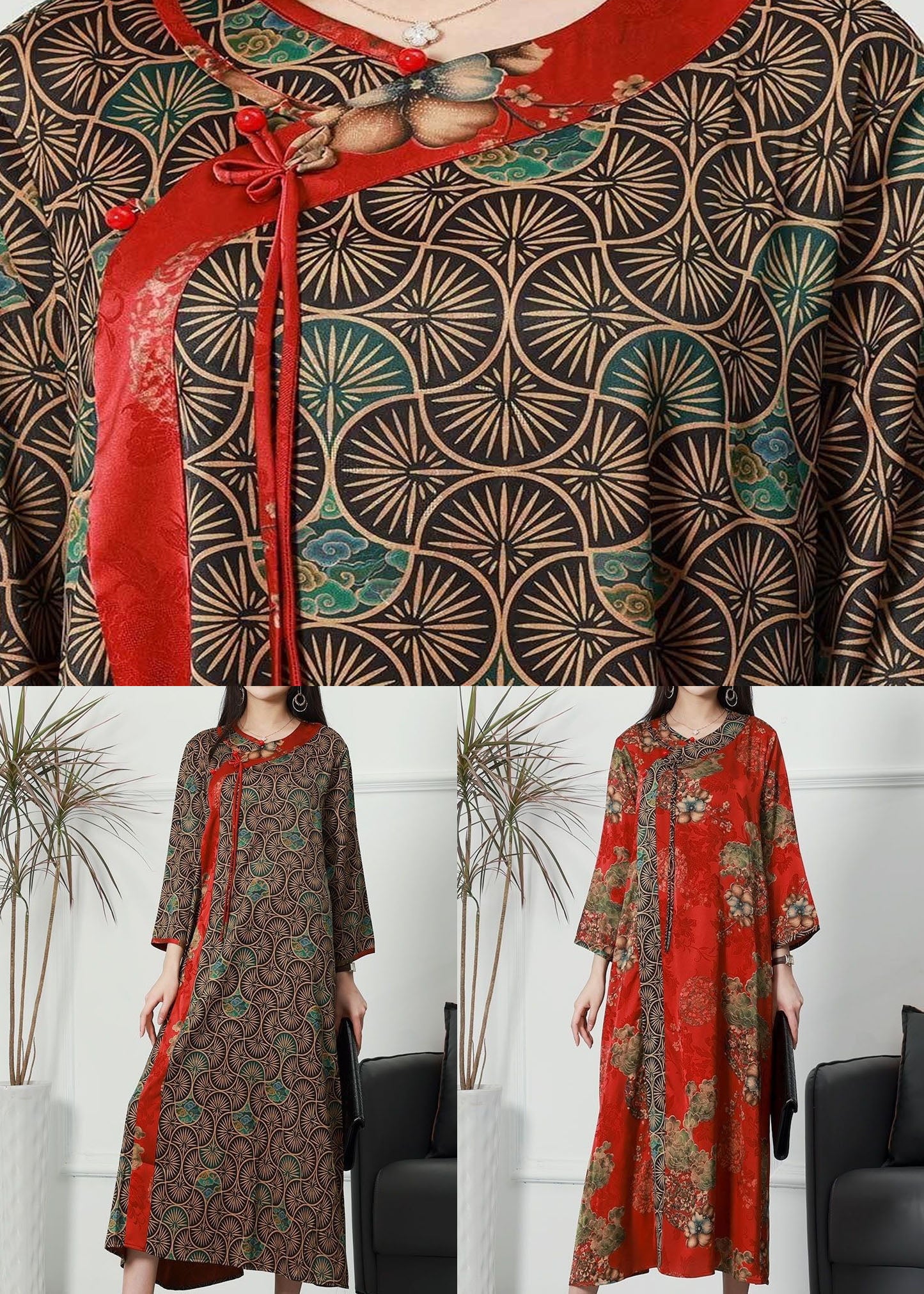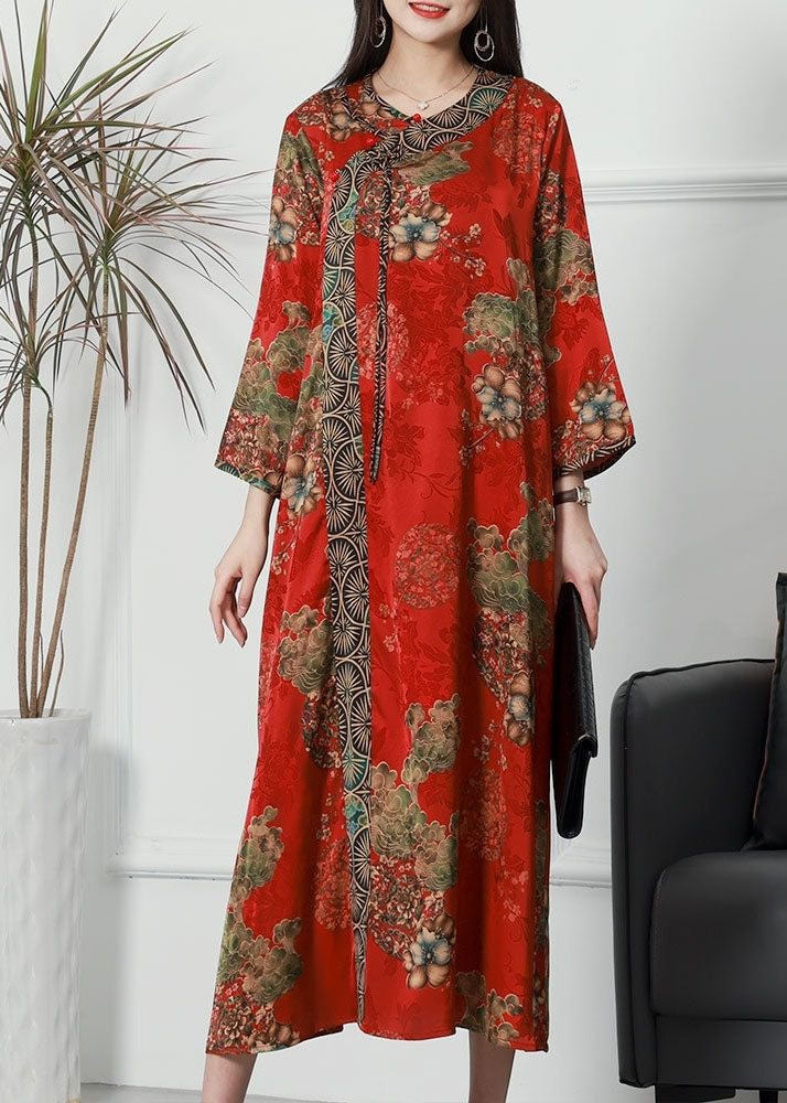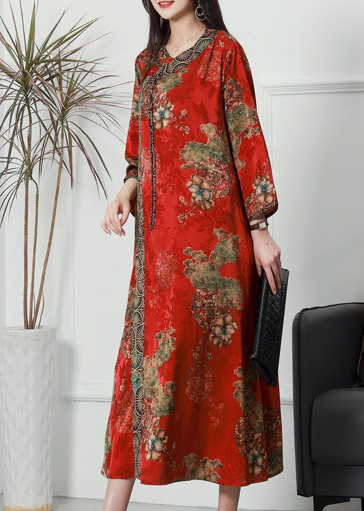 French Red Print Patchwork Tasseled Silk Dresses Spring