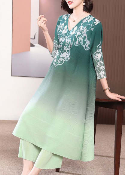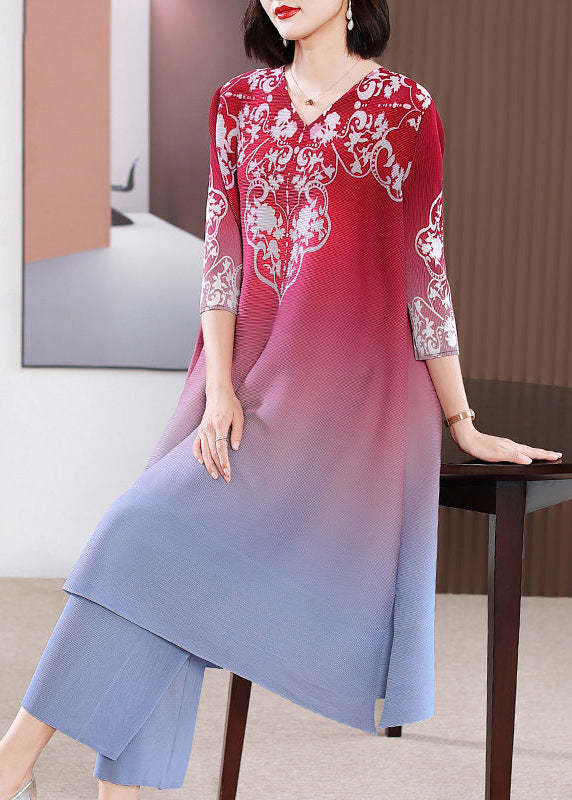 French Red V Neck Print Gradient Color A Line Dress Two Pieces Set Summer