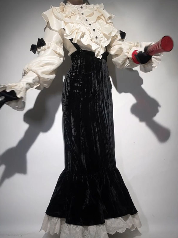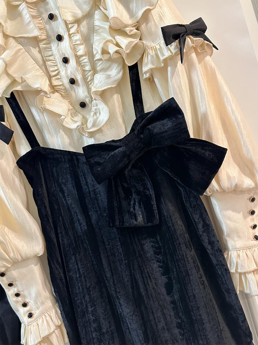 Gothic Lolita Outfits Black Color Block Lace Ruffles Long Sleeves Top Skirt