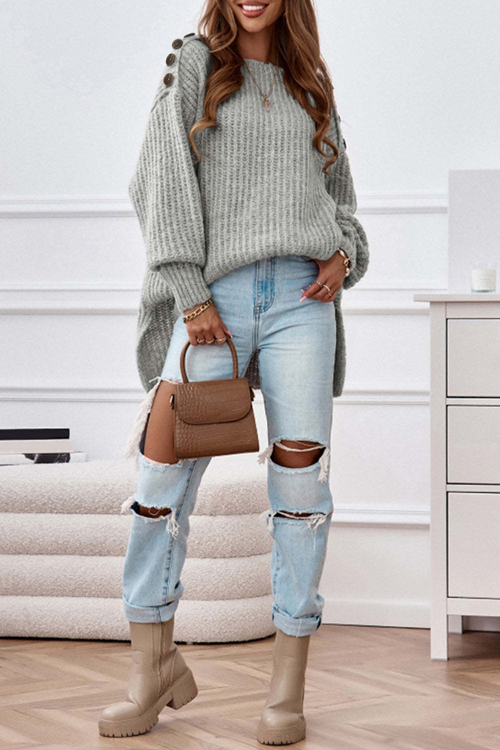Gray Buttoned Drop Shoulder Oversized Sweater