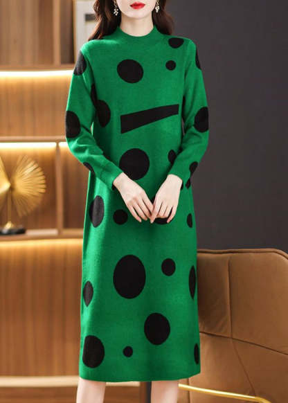 Green Dot Print Patchwork Knit Sweater Dress Turtleneck Long Sleeve