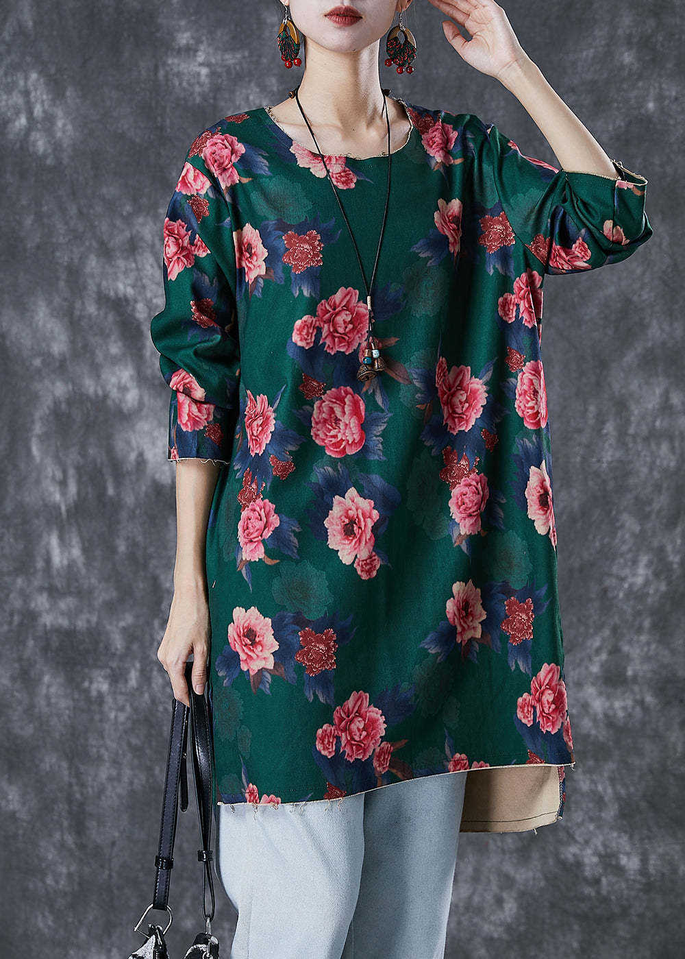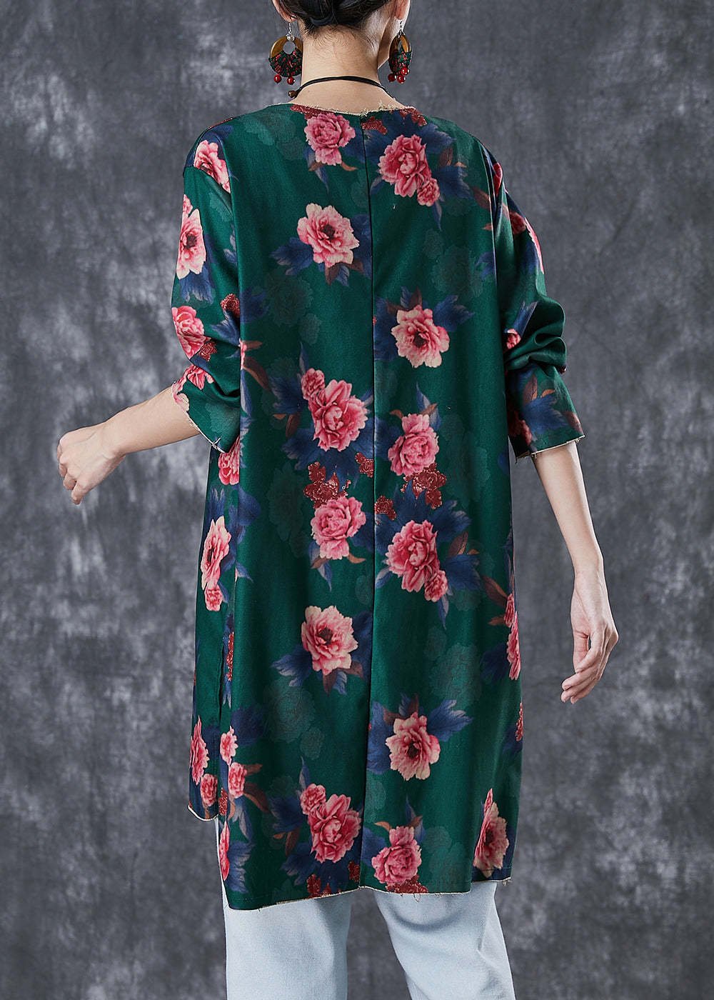 Green Floral Print Linen Mini Dress Side Open Fall