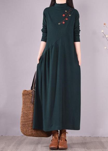 Handmade Blackish Green Embroidery Clothes High Neck Cinched Robes Spring Dresses