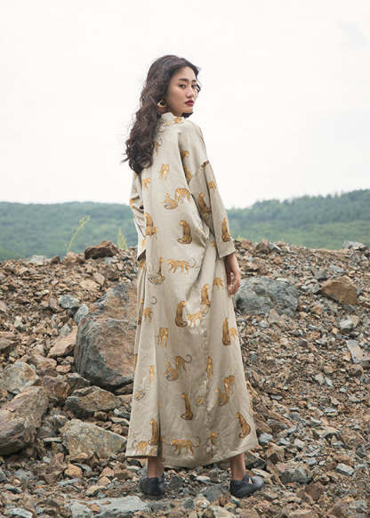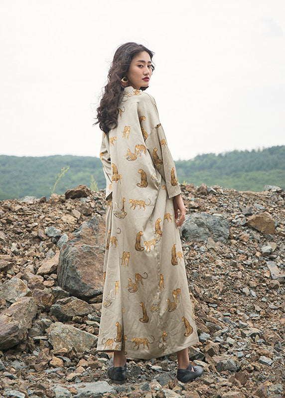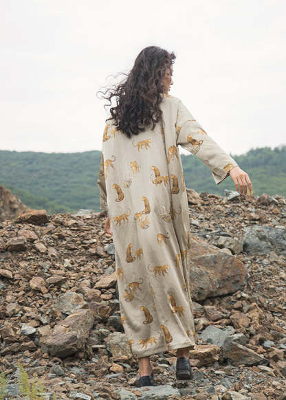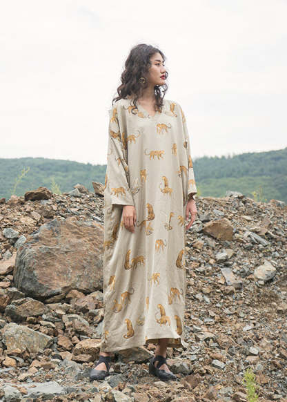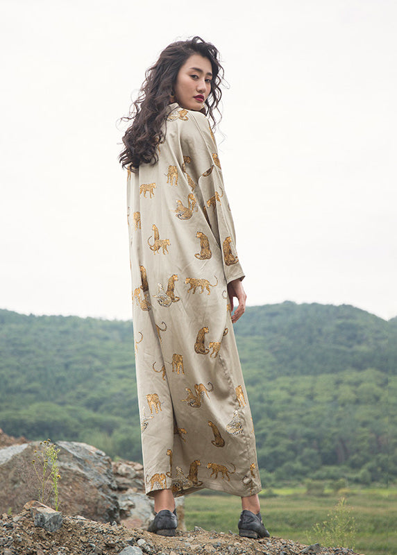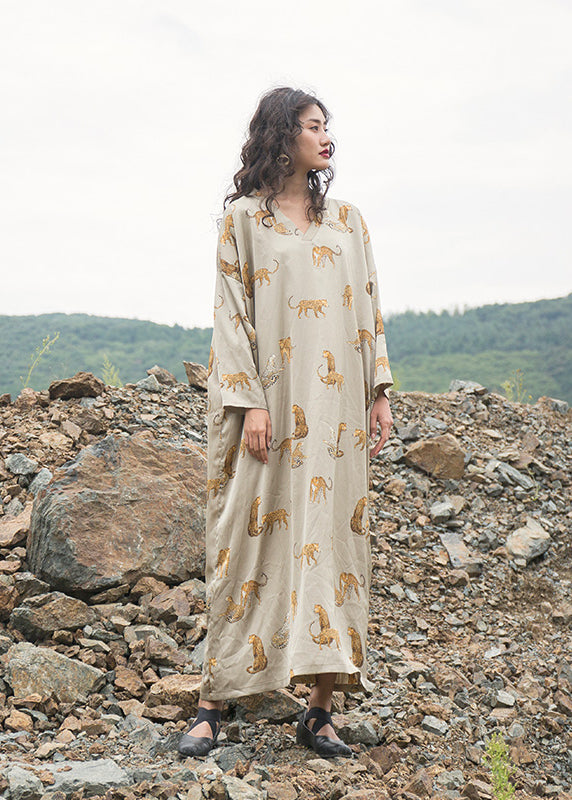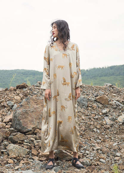 Italian Apricot V Neck Animal Print Silk Robe Dresses Fall