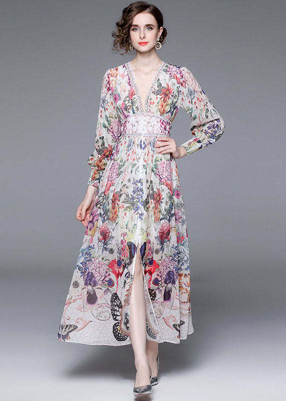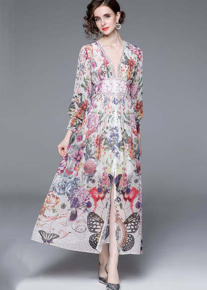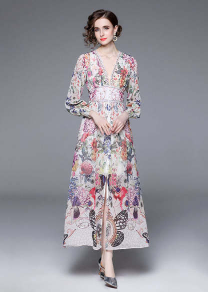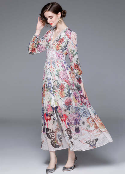 Italian Floral V Neck Front Open Patchwork Chiffon Vacation Dresses Long Sleeve