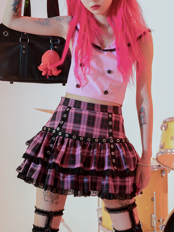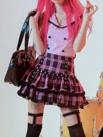Lolita Skirt Plaid Layered Lace Trim Mini Skirt