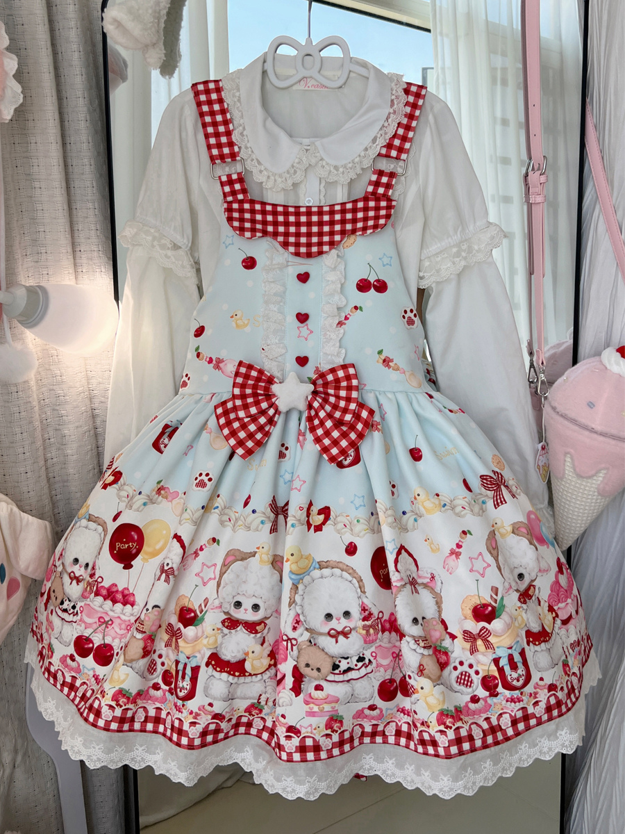Step into a world of sweetness with this adorable Lolita jumper skirt dress, featuring an all-over bow print pattern and delicate lace trim accents for the perfect doll-like aesthetic. The puffy silhouette creates beautiful volume (petticoat not included), while the adjustable shoulder straps and hidden side pockets offer both style and functionality. Crafted from high-quality cotton blend, this dress is ideal for tea parties, dates, or any occasion calling for enchanting Sweet Lolita fashion.