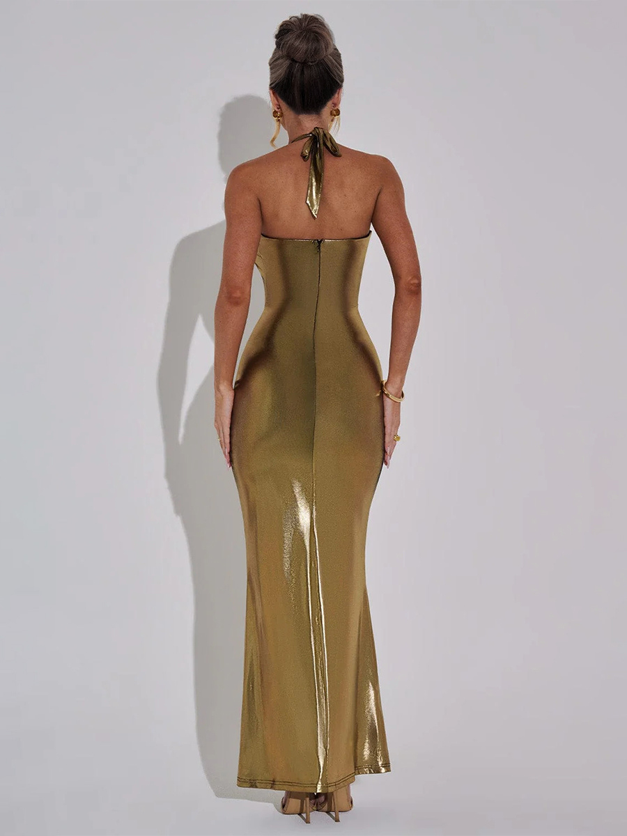 Metallic Gold Maxi Dress With Open Back Party Halter Bodycon Dress For Women 2025