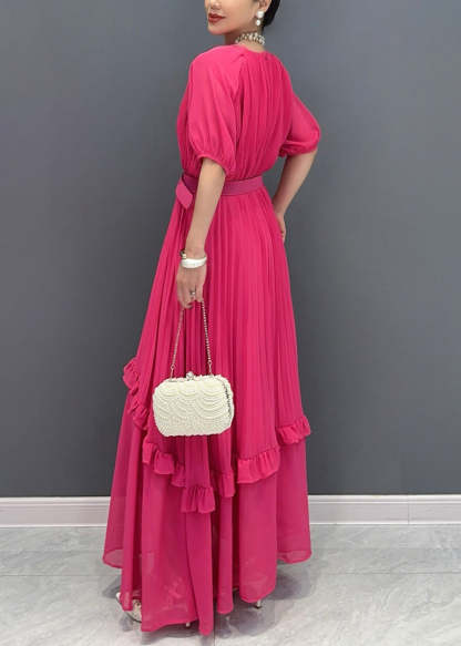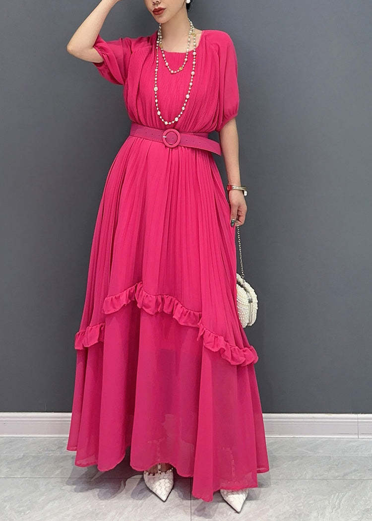 Natural Red Ruffled Patchwork Sashes Chiffon Long Dress Summer