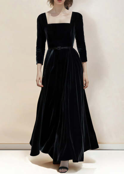 New Black Square Collar High Waist Silk Velvet Dresses Bracelet Sleeve