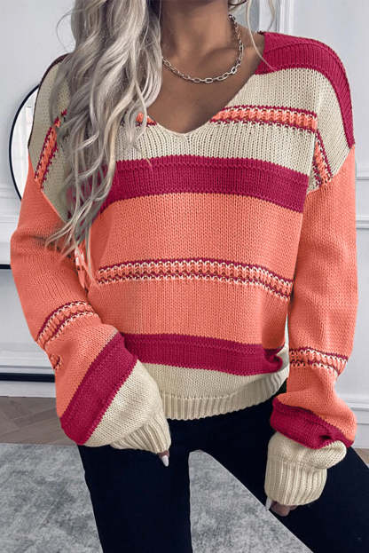 Peach Blossom Striped Pattern Knit V Neck Sweater