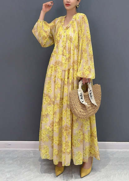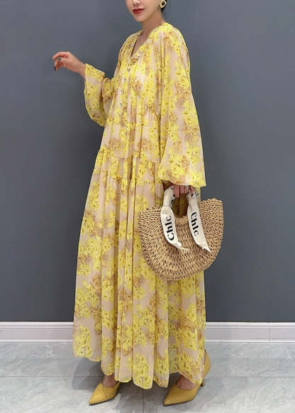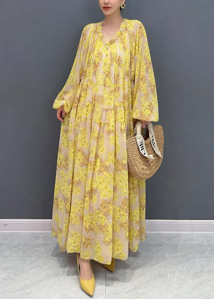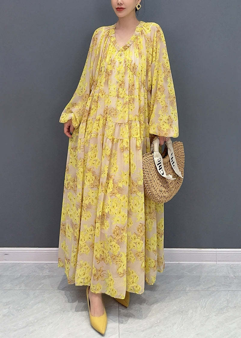 Plus Size Yellow V Neck Ruffled Print Chiffon Long Dresses Fall