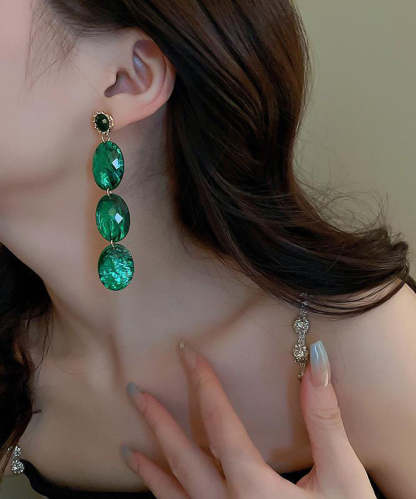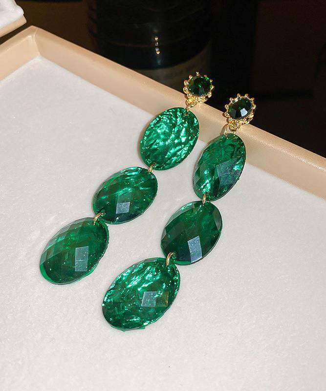 Retro Green Alloy Acrylic Zircon Oval Tassel Drop Earrings