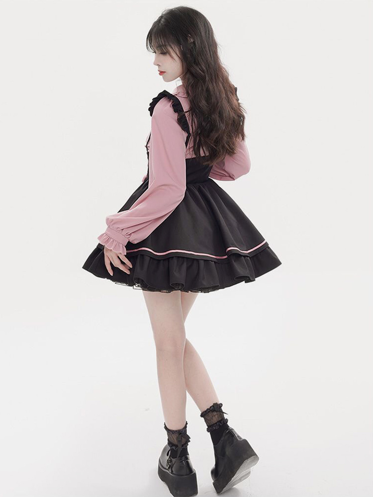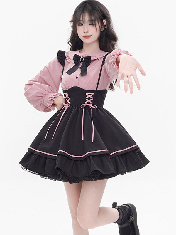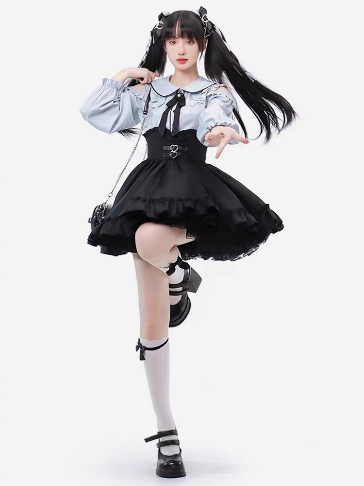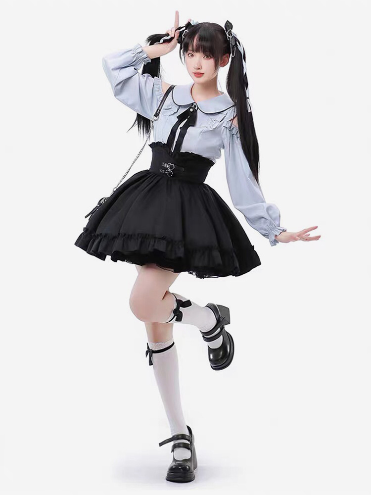 Steampunk Lolita Outfits Light Sky Blue Lace Up Ruffles Long Sleeves Blouse Skirt