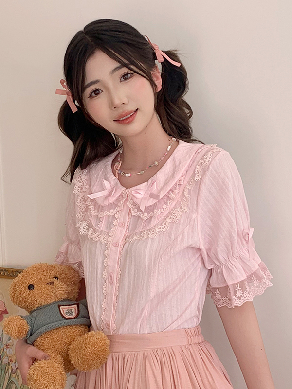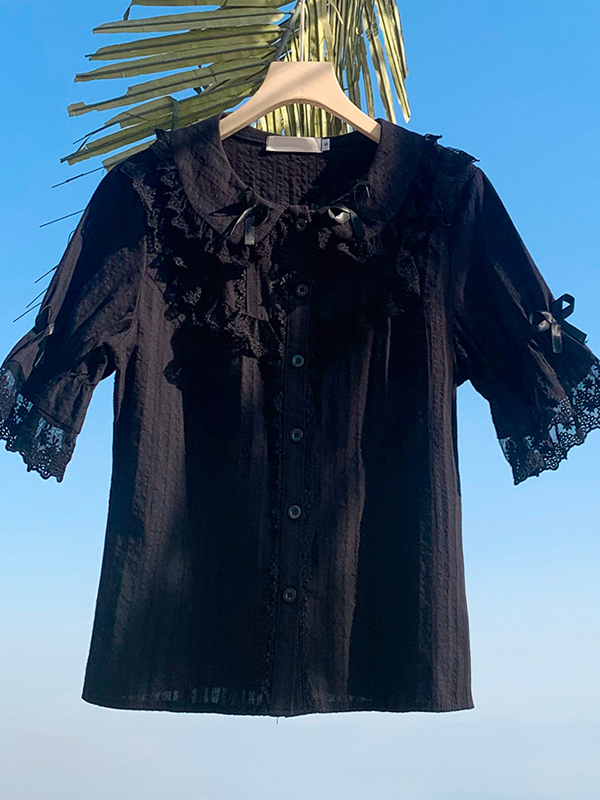 Sweet Lolita Blouses Lace Bows Lolita Top Short Sleeves Blouse Lace Black Lolita Shirt