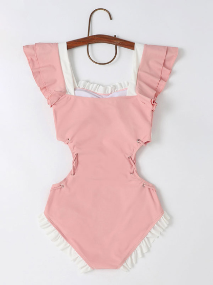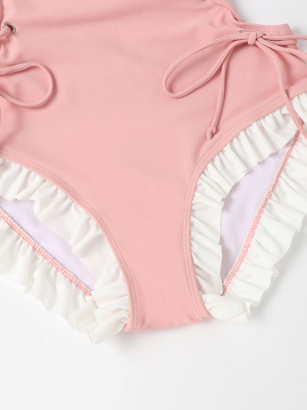 Sweet Lolita Swimsuit Pink Ruffles Bows Lace Up Sleeveless Jumpsuit