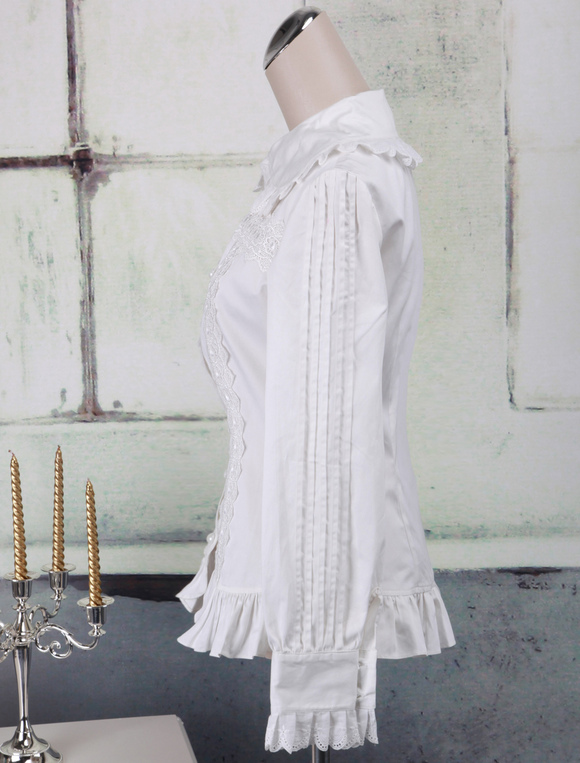 Sweet White Cotton Lolita Blouse Long Sleeves Ruffles Lace Trim Turn-down Collar