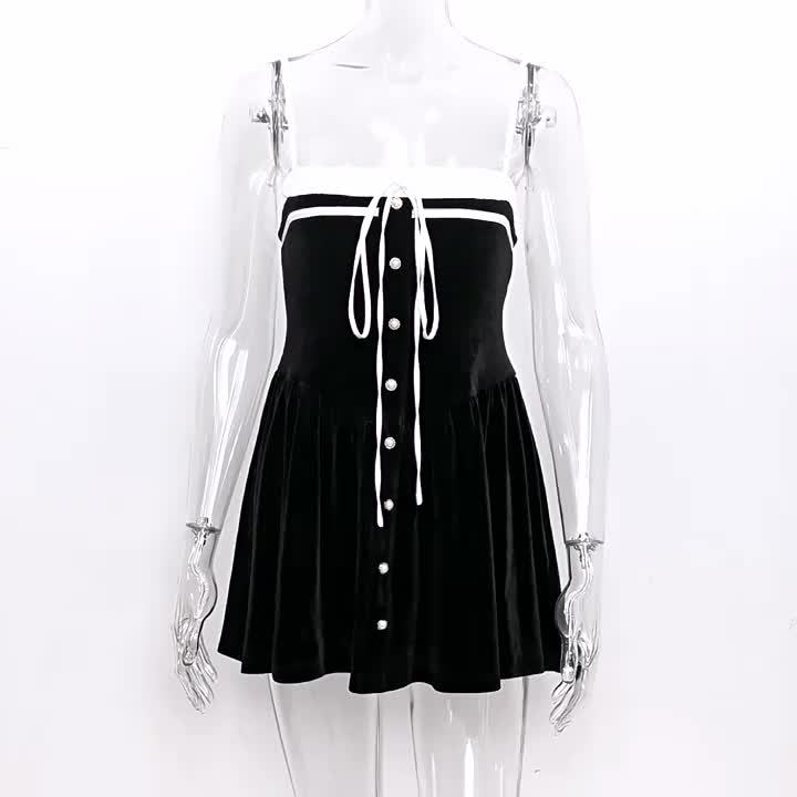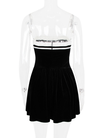 Velvet Dress Black Irregular Ruffles Daily Casual Sleeveless Two-Tone Straps Neck Summer Short Mini Dresses