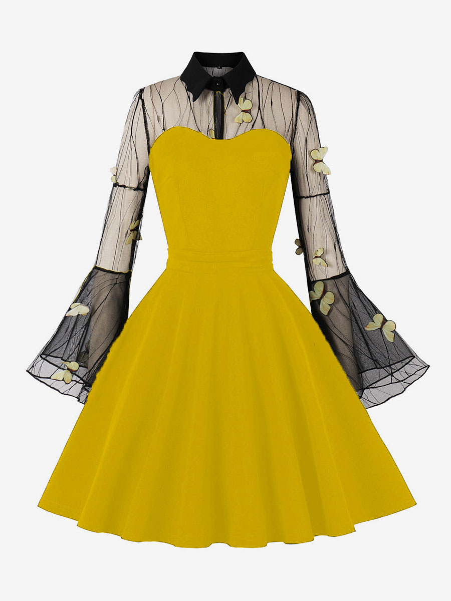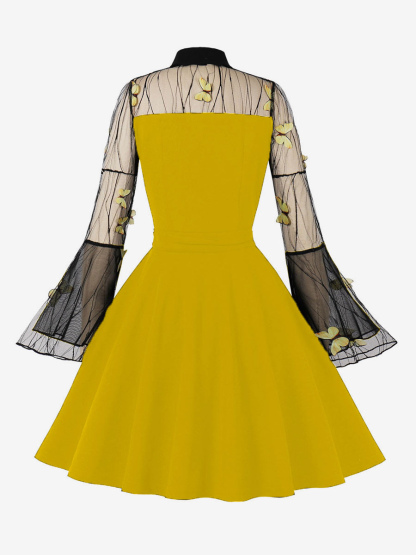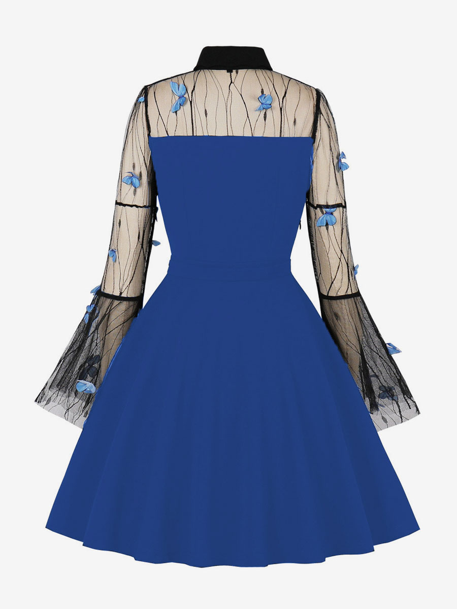 Vintage Dress 1950s Audrey Hepburn Style Lilac Animal Print Lace Long Sleeves Stand Collar Knee Length Swing Dress