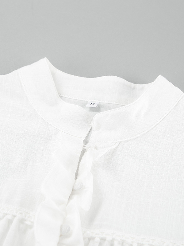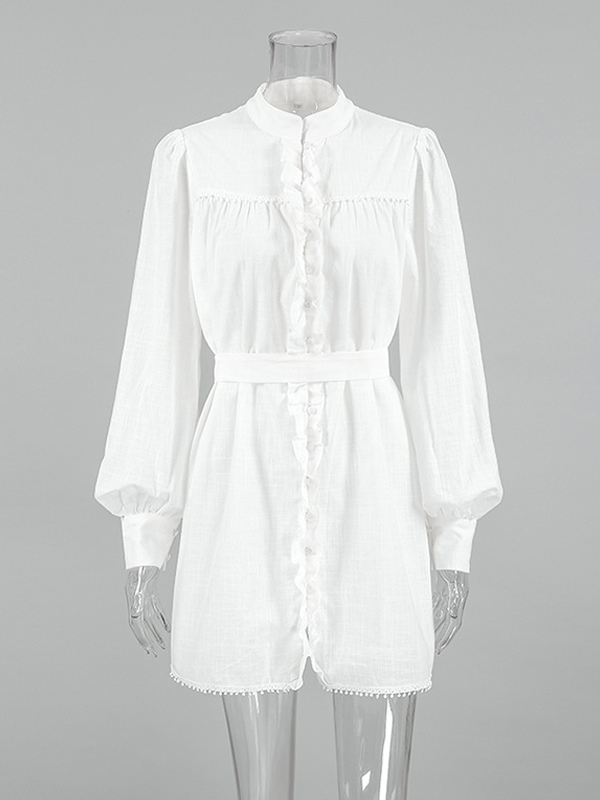 White Puff Sleeve Shirt Dress Stand Collar Long Sleeve Belted Mini Dress 2025