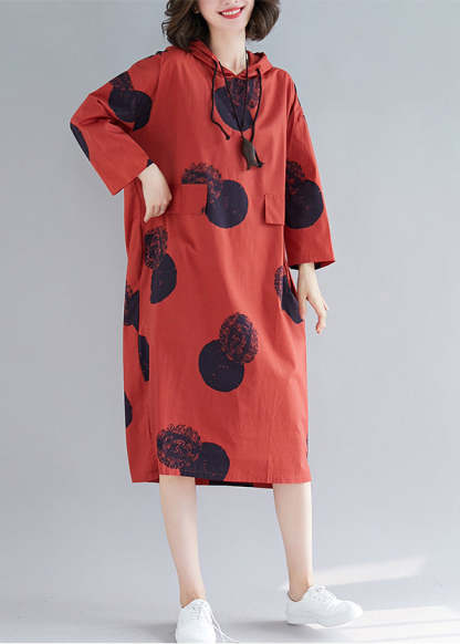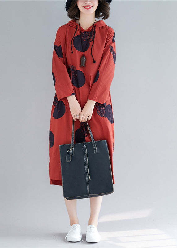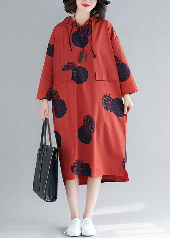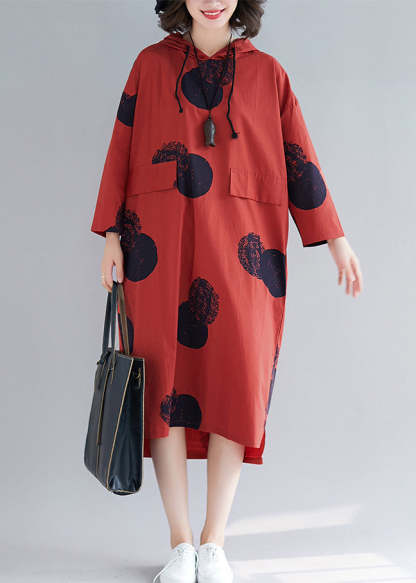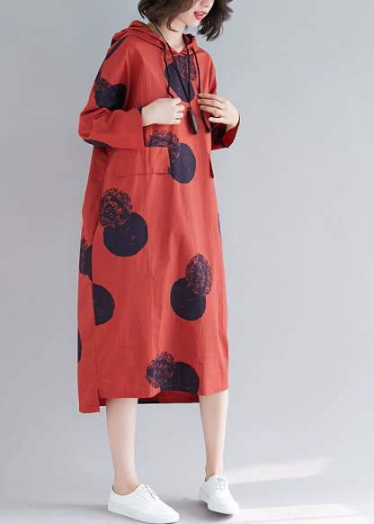 Women Red Hooded Print Cotton Loose Sweatshirt Dress Fall